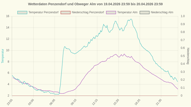 | Freitag, 24.04.2026 | Bewölkung unverändert | 0.2 / 14.5 | 0% | ||